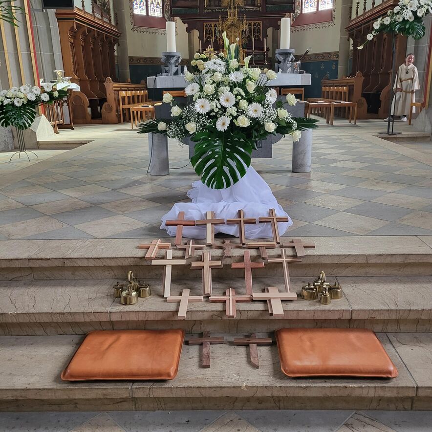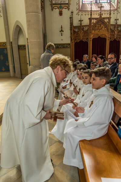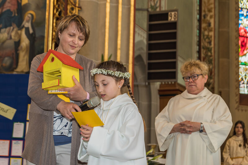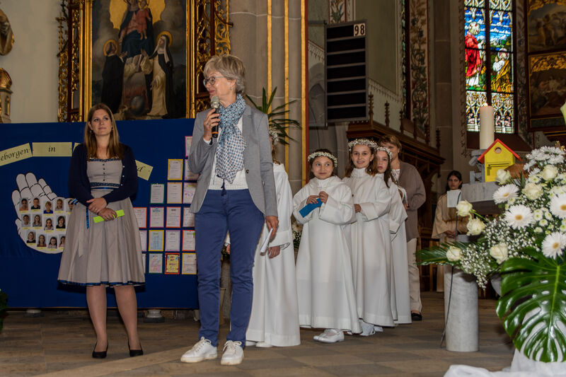 Das Grundthema "Geborgen in Gottes Hand" begleitete die Feier über die Texte und Fürbitten der Kinder und die Predigt der Pfarreibeauftragten Brigitta Schmid. Sie betonte den Halt, den Gottes Liebe allen Menschen gibt und wie dabei das kindliche Vertrauen allen als Vorbild und Wegweiser dienen kann. Danach empfingen die Kinder vom Jungpriester Ivan Saric zum ersten Mal die Heilige Kommunion.