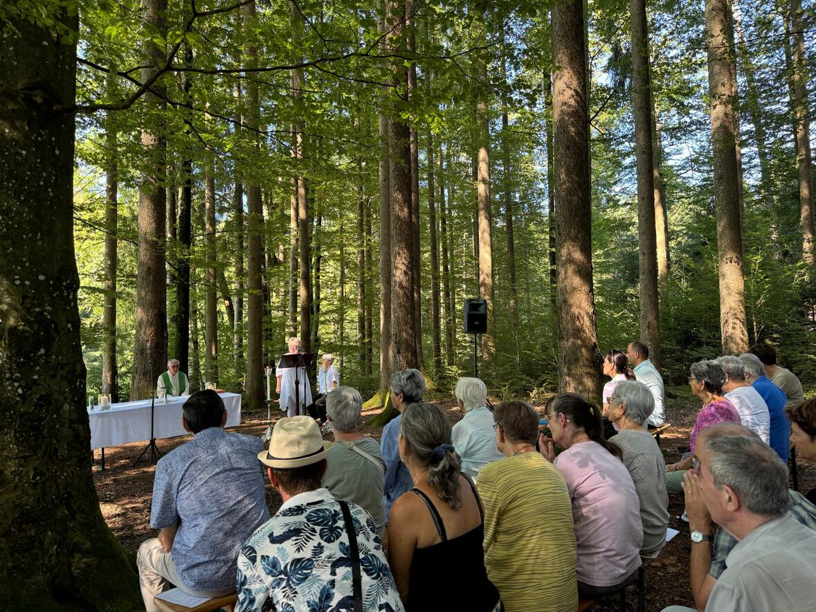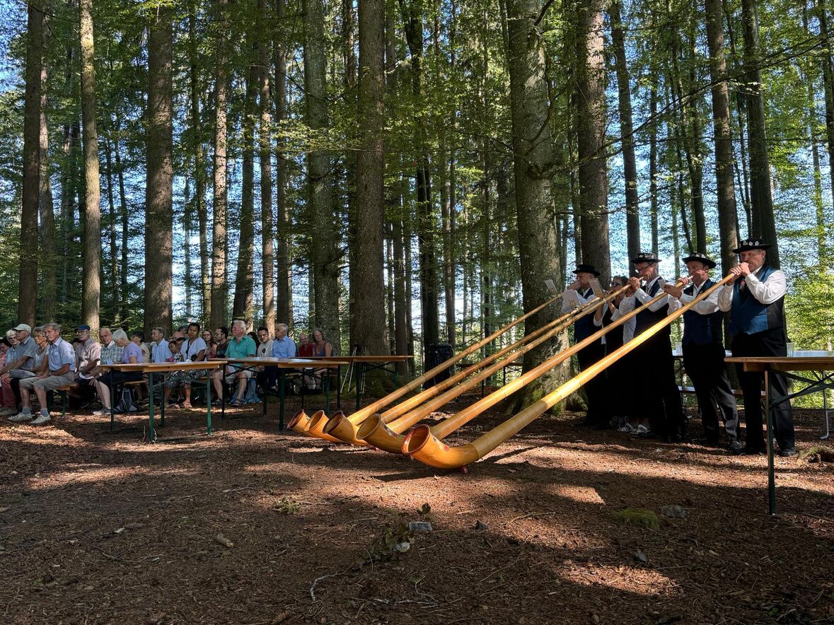 Pfarrer Christoph Schönenberger, die Seelsorgerin Brigitta Schmid Pfändler und die Pfarreibeauftragte Barbara Wälti feierten mit ca. 80 Erwachsenen und Kindern einen festlichen , naturnahen Gottesdienst. Musikalisch umrahmt wurde die Feier von der Alphorngruppe vom Tannenberg.
