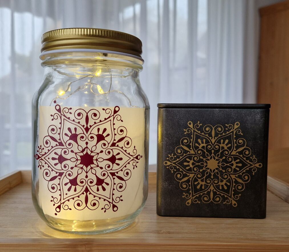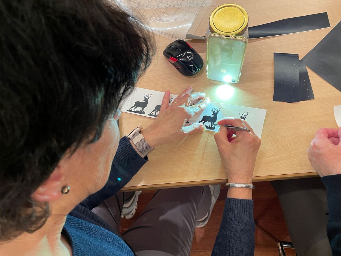 mit dem Plotter zu verzieren. Besonders eilig widmeten sich die Frauen den Laternengläsern, welche nun in warmen Farben leuchten. Auch persönliche Guetslibüchsen wurden liebevoll beklebt und dekoriert, so dass jede Dose zu einem Unikat wurde. Die Atmosphäre im Kurs war so konzentriert und inspirierend, dass wir etwas überziehen mussten, weil es schwerfiel, sich loszureissen.